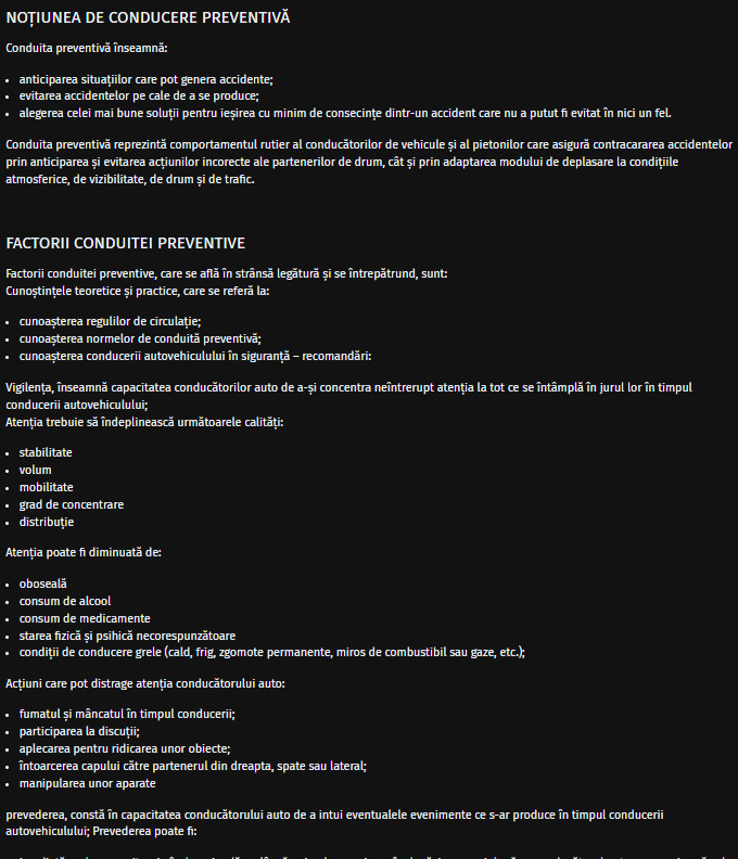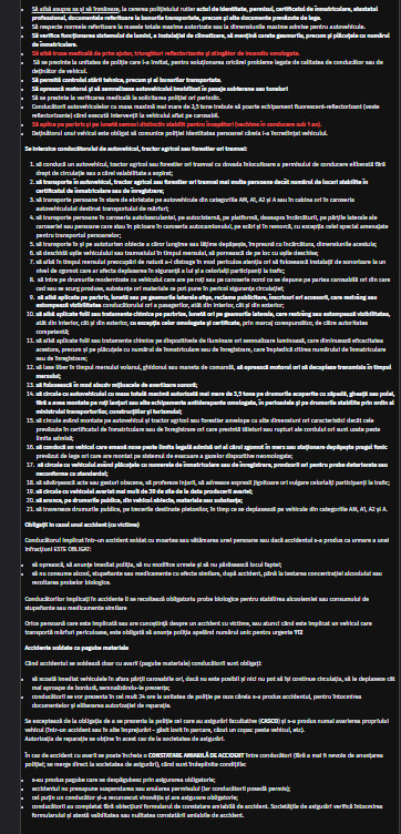 Pentru a menține siguranța și disciplina în trafic, fiecare șofer trebuie să respecte o serie de obligații legale și morale. Această secțiune acoperă responsabilitățile principale ale conducătorilor auto: respectarea semnelor de circulație, adaptarea vitezei, acordarea priorității, purtarea centurii de siguranță, precum și obligațiile în caz de...