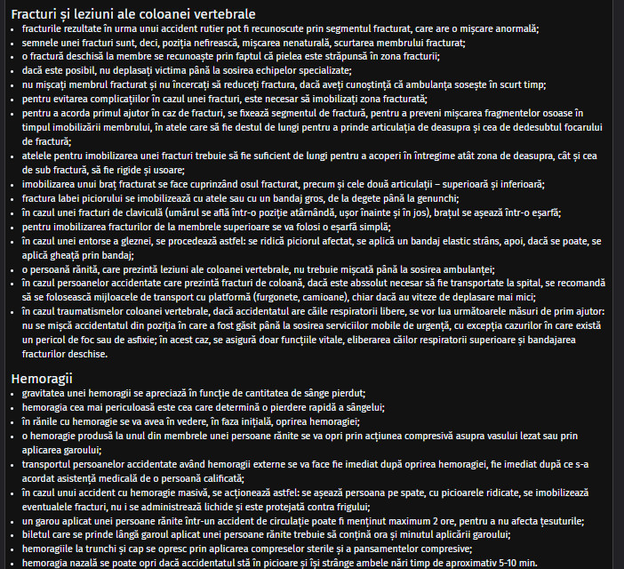 Primul ajutor poate face diferența dintre viață și moarte în cazul unui accident rutier. Această secțiune oferă informații esențiale despre intervenția rapidă în situații critice: evaluarea stării victimei, eliberarea căilor respiratorii, oprirea hemoragiilor și poziționarea corectă a persoanei accidentate. Indispensabilă pentru orice conducător...